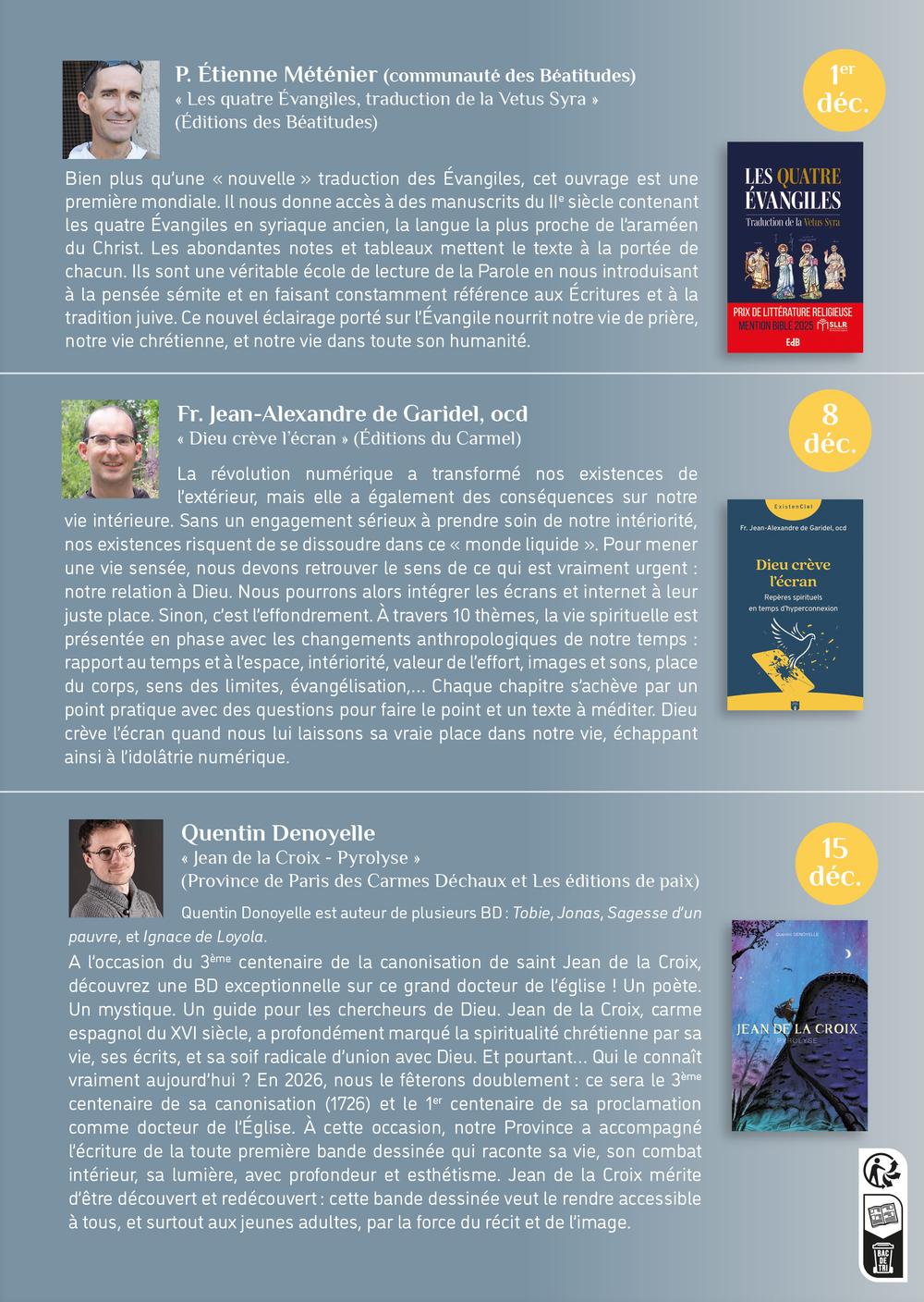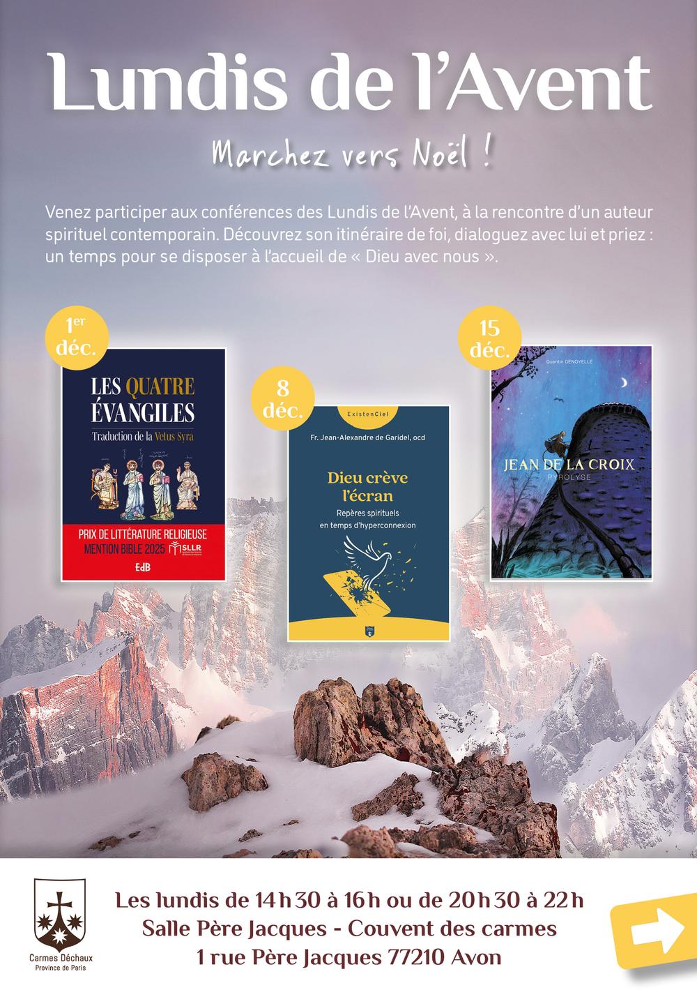 Pendant le temps de l’Avent, venez participer aux conférences au couvent des frères carmes d’Avon. Les lundis de 14h30 à 16h ou de 20h30 à 22h.