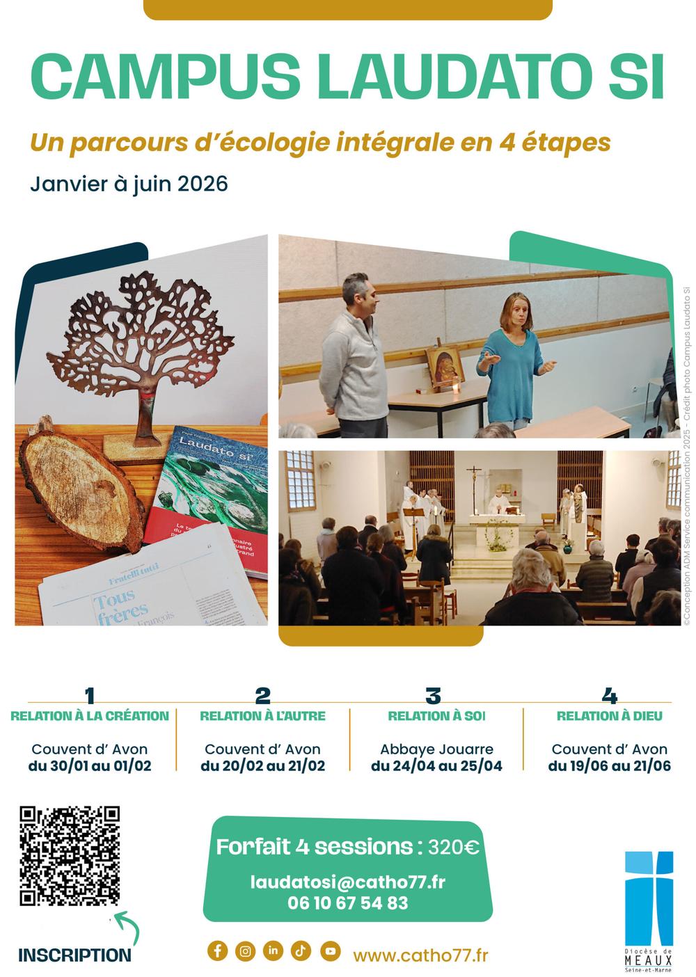 L’équipe d’écologie intégrale du diocèse de Meaux vous propose le Campus Laudato Si’ 77, un parcours-découverte en quatre sessions qui se dérouleront au cours du 1er semestre 2026.